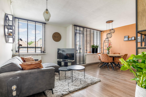 Via de woonkeuken is de woonkamer bereikbaar. Deze is gelegen aan de voorzijde van de woning en heeft een langwerpige opzet, waardoor er genoeg ruimte is voor een zithoek en eventueel een extra eettafel of werkplek. De woonkamer is licht en praktisch in te delen.